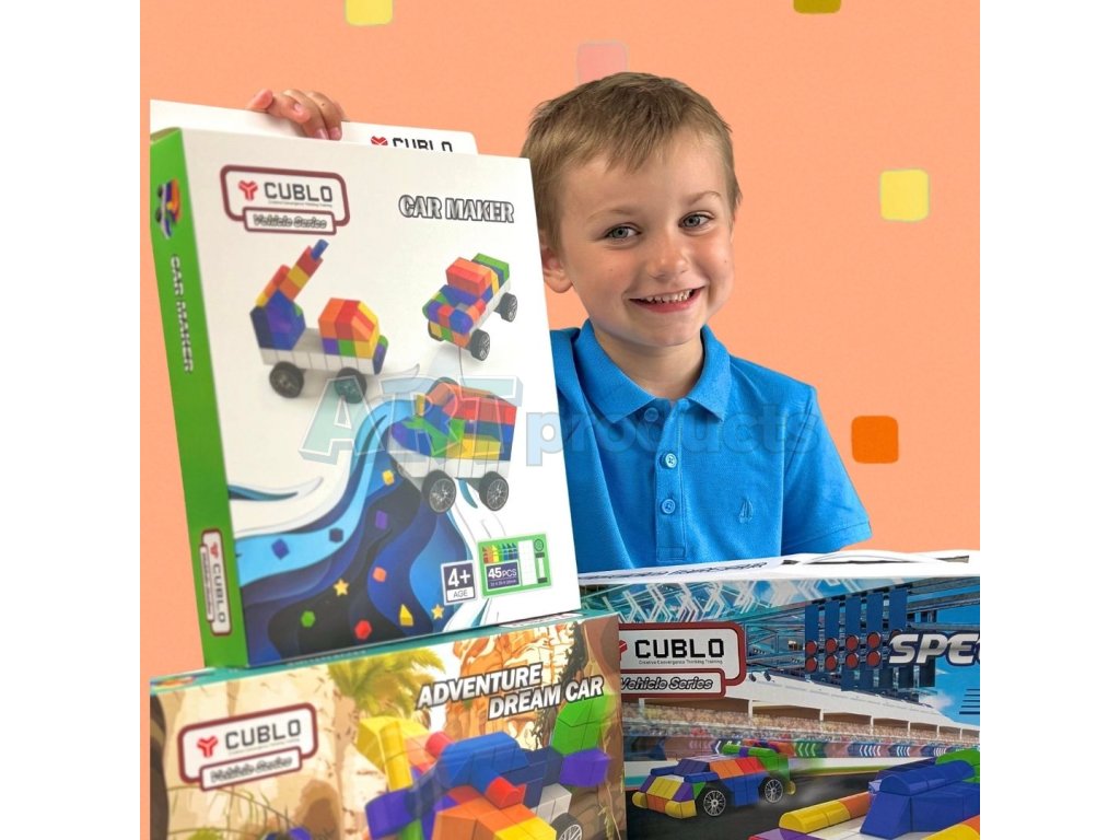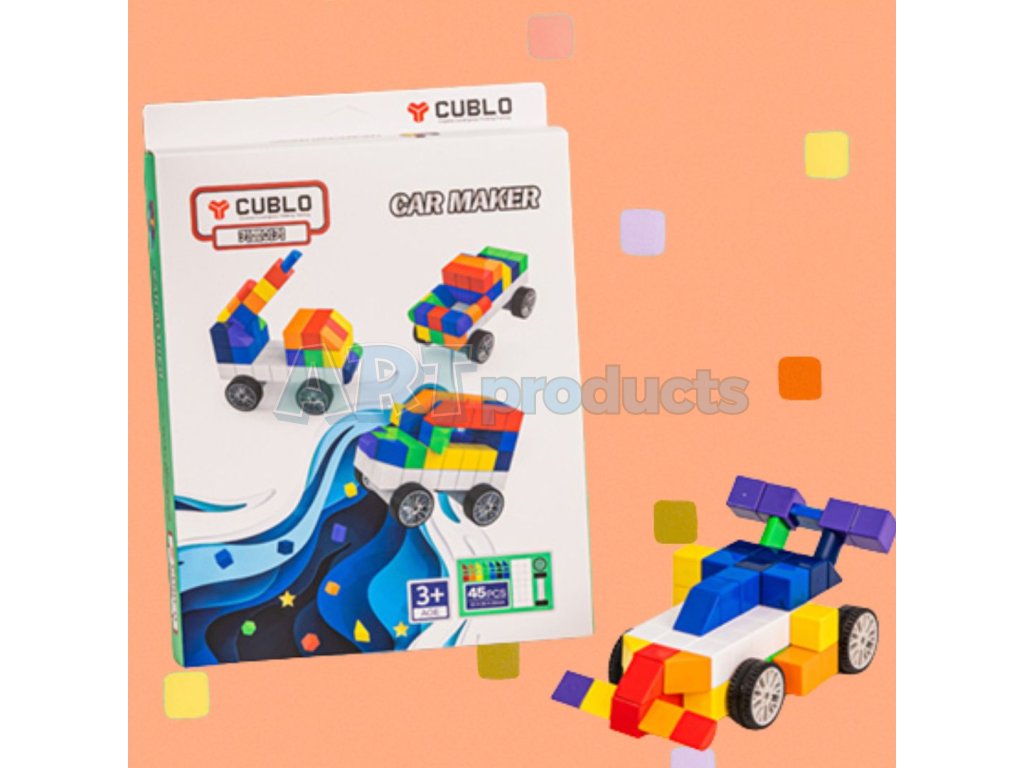 Cublo Car Maker je sada 45 pevných magnetických dílků z Jižní Koreje, určených pro stavbu přizpůsobených vozidel – od klasických aut přes čtyřkolky až po létající stroje. Díky různým tvarům (kostky, trojúhelníky, válce) umožňuje konstruovat nejen vozidla, ale i dráhy, rampy nebo geometrické modely.