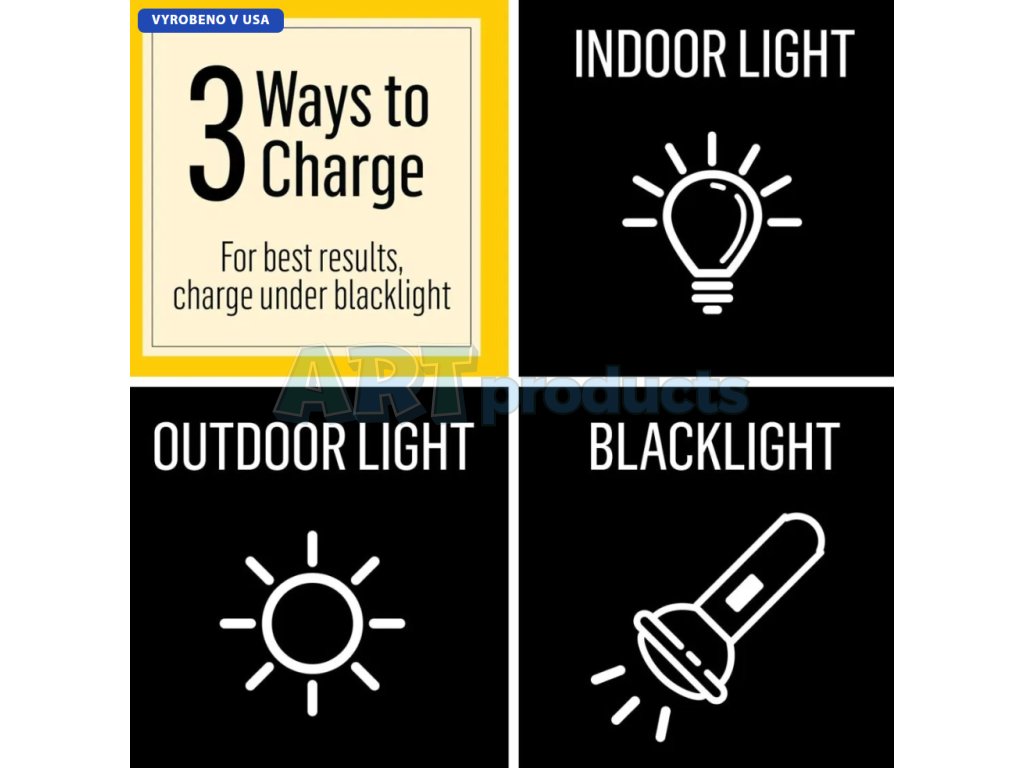 - Svítí ve tmě – aktivuje se černým světlem nebo po nasvícení