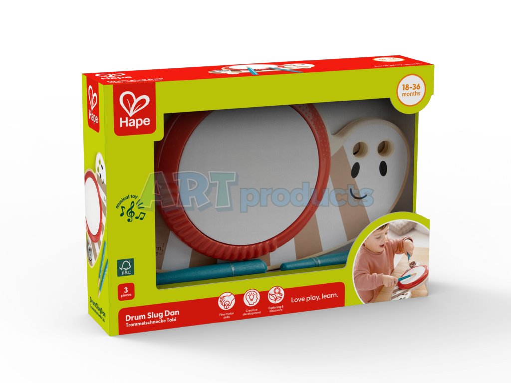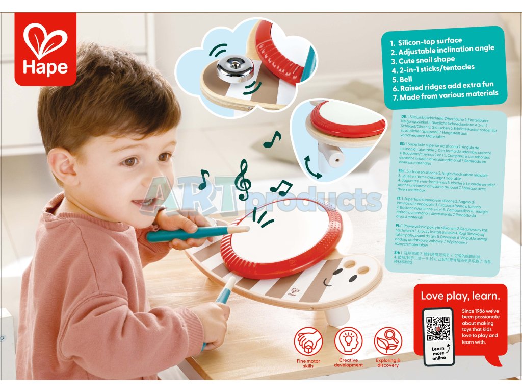 HAPE Slimák Dan je zábavný a originální buben, který v sobě spojuje hudební a motorický rozvoj. Děti mohou bubnovat do těla slimáka paličkou, což podporuje jejich koordinaci ruky a oka i smysl pro rytmus. Vzhled slimáka je navržen tak, aby si ho děti okamžitě zamilovaly – usměvavý výraz a pestré barvy přirozeně přitahují pozornost.