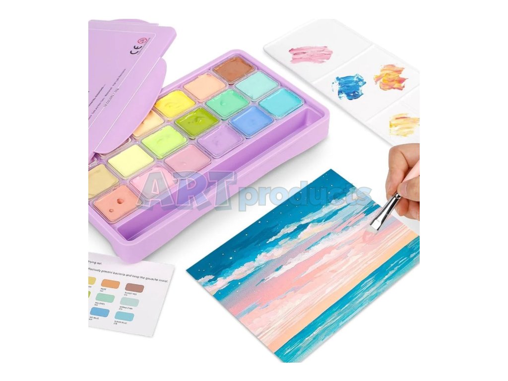 Díky praktickému balení v plastovém kufříku je tento set skvělý i na cesty. Víčka jednotlivých kelímků zajišťují, že barvy nevysychají ani při delším nepoužívání. Barvy lze používat husté pro neprůhledný efekt, nebo naředit vodou a dosáhnout jemného akvarelového vzhledu.
