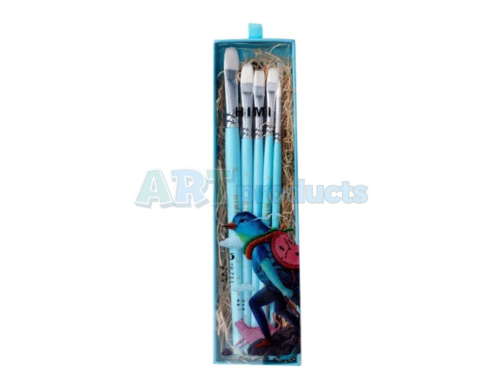 Sada HIMI Little Bird Blue obsahuje pět pečlivě vybraných štětců, které pokrývají široké spektrum malířských technik. Kulatý štětec (č. 4) je ideální pro detailní práci a jemné linie. Plochý štětec (č. 5) umožňuje rovnoměrné nanášení barvy na větší plochy. Tři filbert štětce (č. 6, 8, 10) kombinují vlastnosti kulatých a plochých štětců, což je činí univerzálními pro různé techniky.