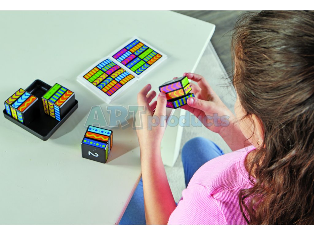 Kostky můžete otáčet, posunovat a klikat, abyste vytvořili určený vzor podle přiloženého průvodce. Pokyny obsahují více než 40 různých výzev, které stimulují kreativní a kritické myšlení, podporují jemnou motoriku a trénují trpělivost i prostorové vnímání.