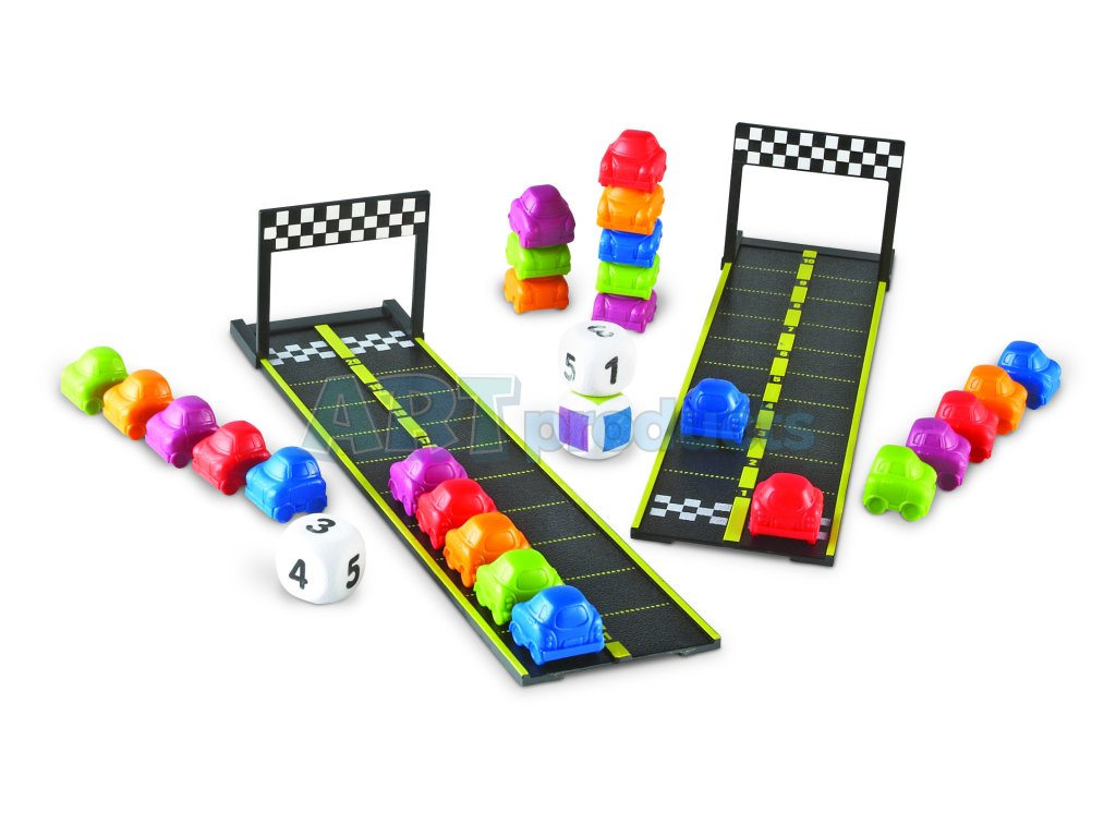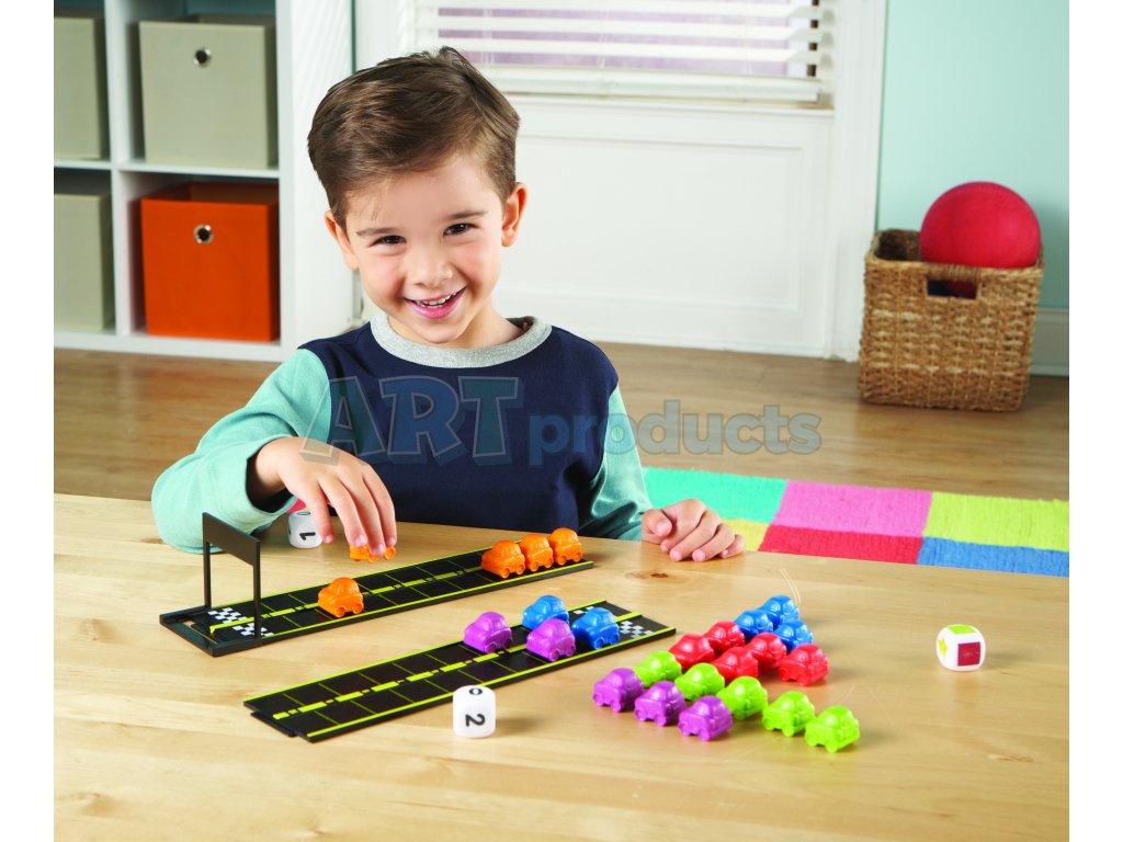 Learning Resources Mini Motor Math Activity Set je interaktivní učební sada s motivem závodních autíček, která zábavnou formou podporuje základní matematické dovednosti. Sada obsahuje 25 barevných mini autíček (v pěti barvách), dvě propojitelné dráhy, jednu barevnou a dvě číslicové kostky a nápaditý průvodce aktivitami.