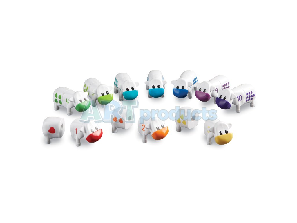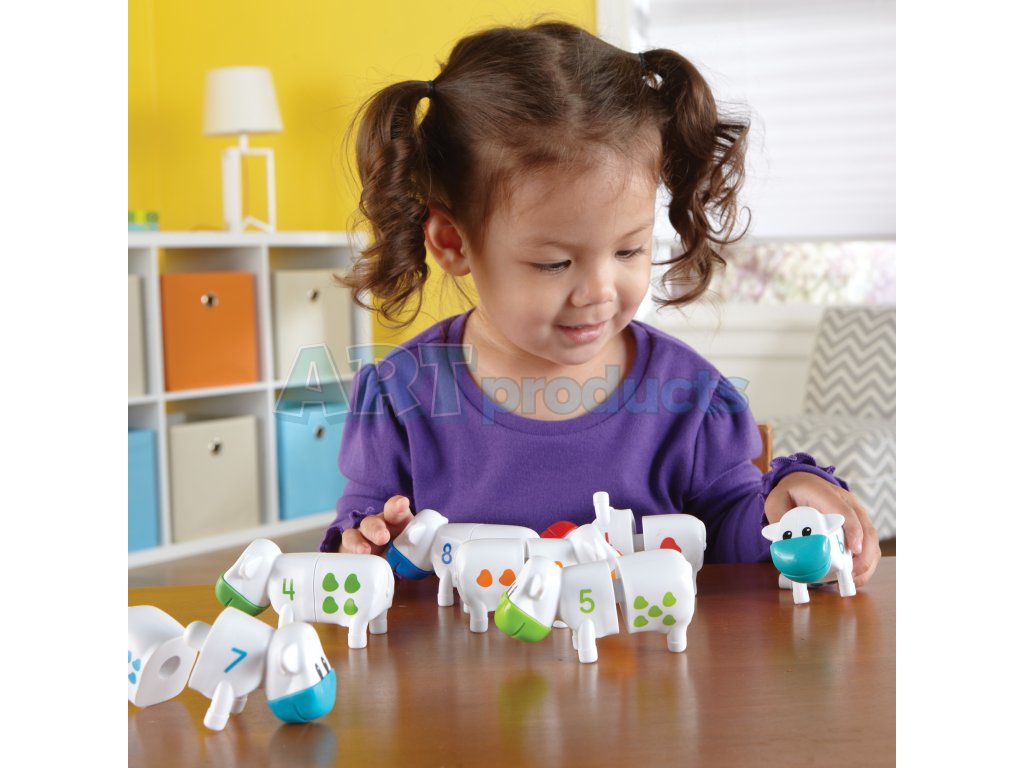 Snap-n-Learn™ Počítání kravičky od značky Learning Resources je vzdělávací hračka, která pomáhá dětem zábavnou formou osvojit si první matematické dovednosti. Každá kravička je rozdělena na dvě části – na přední je číslo, na zadní odpovídající počet teček. Úkolem dítěte je najít správné spojení a složit celou kravičku.
