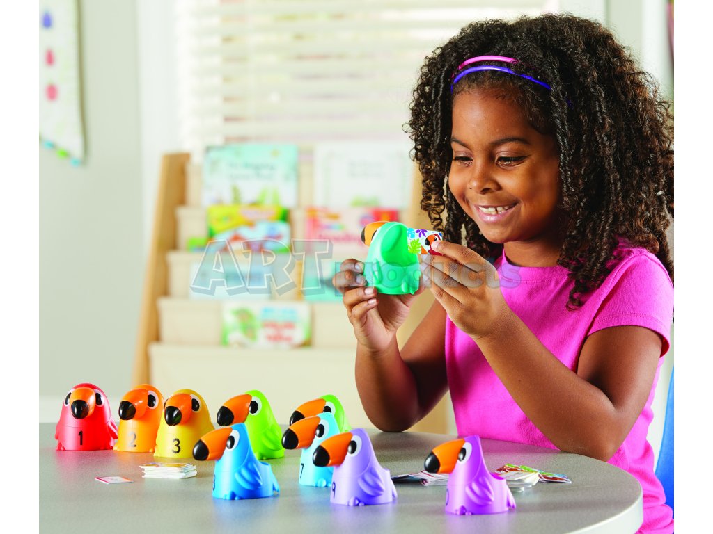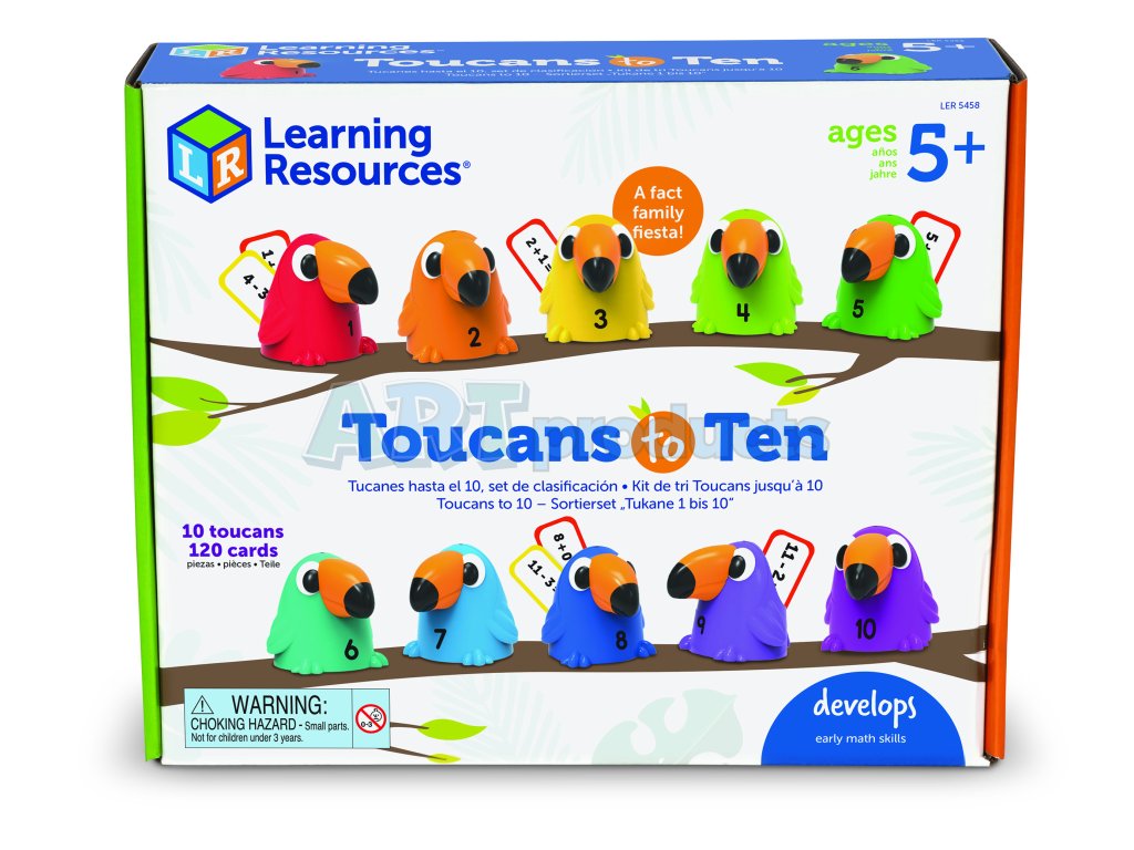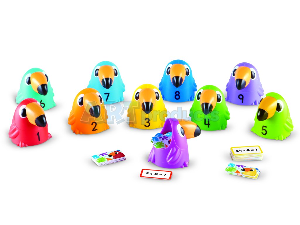 Learning Resources Toucans to 10 je interaktivní matematická sada, která promění výuku sčítání a odčítání v barevnou a zábavnou hru. Set obsahuje deset středně velkých tukaních figurek číslovaných od 1 do 10, každá v živé barvě, a k nim 120 karet s rovnicemi (addice a subtrahce).
