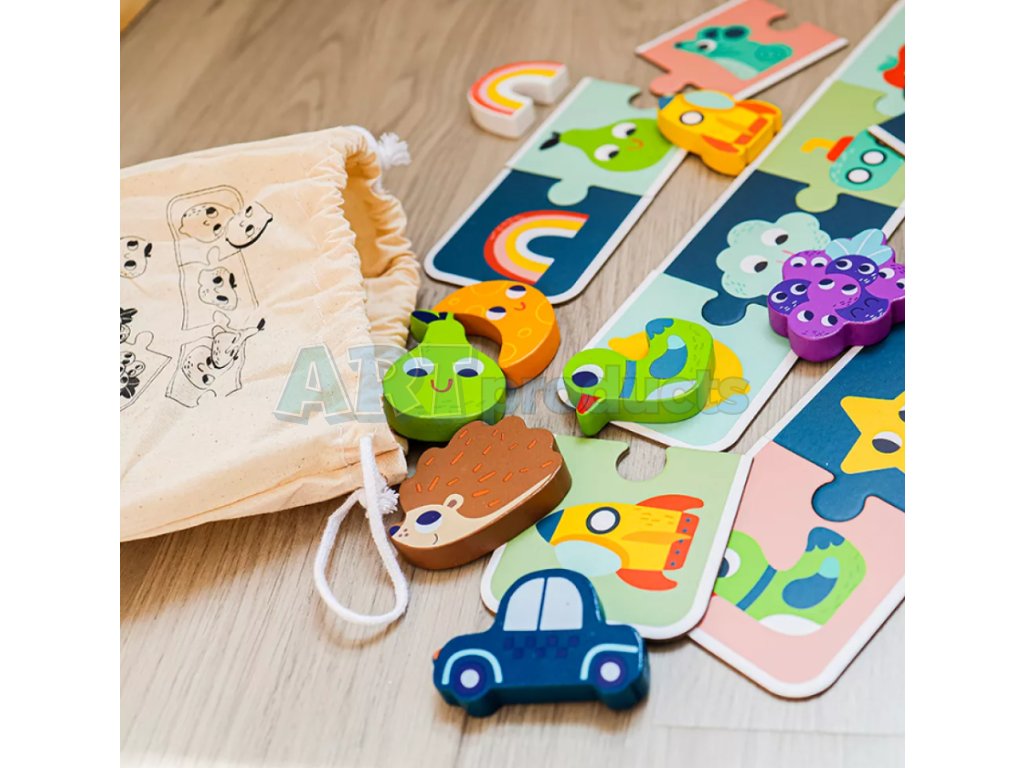 Tato hračka je ideální pro rodiče, kteří hledají smysluplné hry podporující přirozený vývoj dítěte. Stačí si vybrat obrázek a strčit ruku do bavlněného sáčku – dítě se snaží najít dílek, který odpovídá kartičce, pouze pomocí hmatu. To pomáhá posilovat jemnou motoriku, koncentraci a především hmatové vnímání.