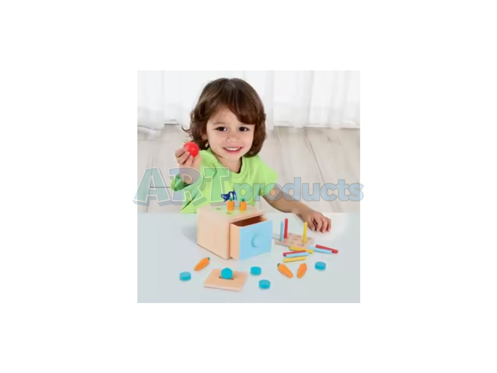 Montessori box od Tooky Toy je ideální vzdělávací pomůcka inspirovaná Montessori principy. Dítě si pomocí čtyř různých vík zkouší postupně náročnější aktivity, čímž se přirozeně rozvíjí jeho zručnost, koncentrace i schopnost logického uvažování.