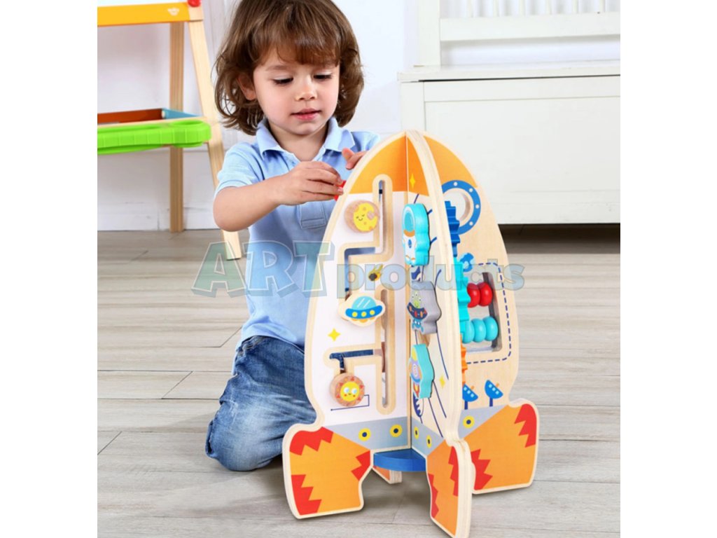 Každá strana rakety přináší novou výzvu – od bludišť a koleček po různé logické úkoly. Hračka děti motivuje k objevování a učí je soustředění a trpělivosti. Díky 3D tvaru je velmi atraktivní i jako dekorace do dětského pokoje.