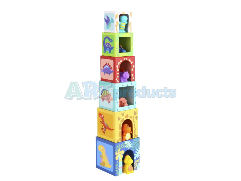 Barevná motorická hračka pro děti od 12 měsíců. Šest různě velkých kostek s dinosaury podporuje rozvoj jemné motoriky, učení tvarů, barev a velikostí. Děti mohou stavět až 64 cm vysokou věž, skládat kostky do sebe nebo hledat správné místo pro každého dinosaura. Skvělá zábava spojená s učením!
