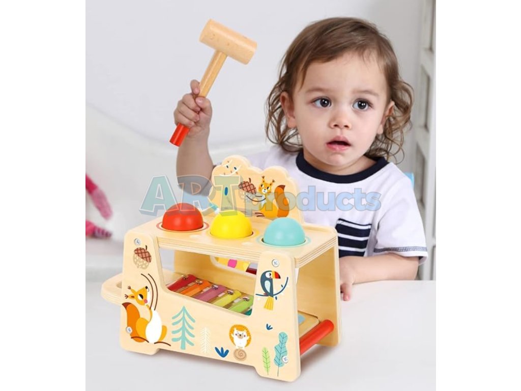 Oblíbená dětská hračka spojuje hru na nástroje a rozvoj motoriky. Zatloukačka s odnímatelným xylofonem přináší nejen radost z hudby, ale i posilování koordinace a smyslů. Vyrobeno z ekologického dřeva, s krásnými motivy lesních zvířátek.